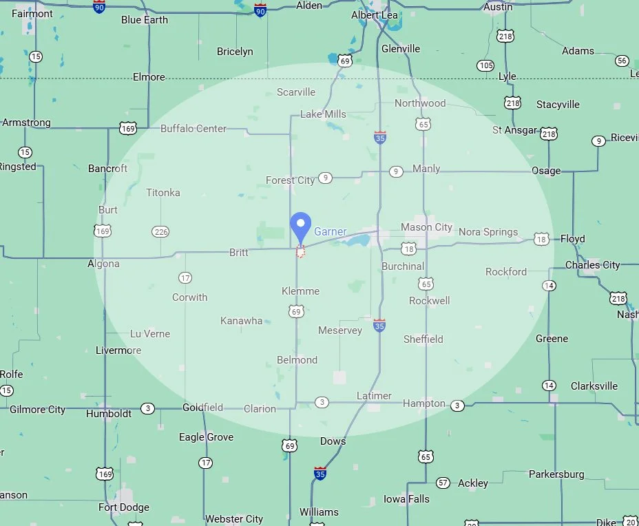 Our service area spans a 1-hour radius from our Garner location around North Iowa including :